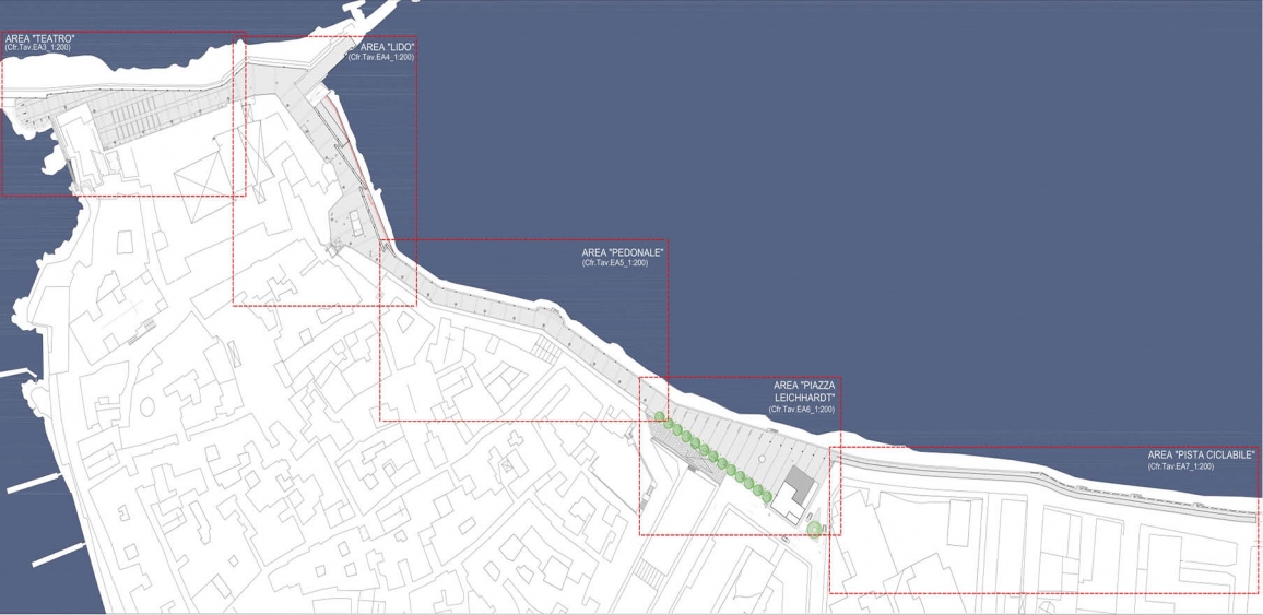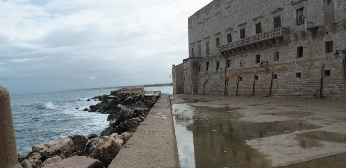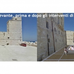 The project interests the redevelopment of the areas overlooking the historic walls, of great interest landascaping, financed with 7th Strategic Axis of P.O. Apulia (development District and Urban Areas) public and private sphere interesting of PIRU. The work consistes in the recovery of a walking bordering with medieval town overlooking the Adriatic Sea promenade skirting the ducal palace (built on 17th) and the “Look – out of Mediterranean Sea” where from N-W front branches off a walkway wooden that connects the walking to the medieval town. This last elevated above the sea.