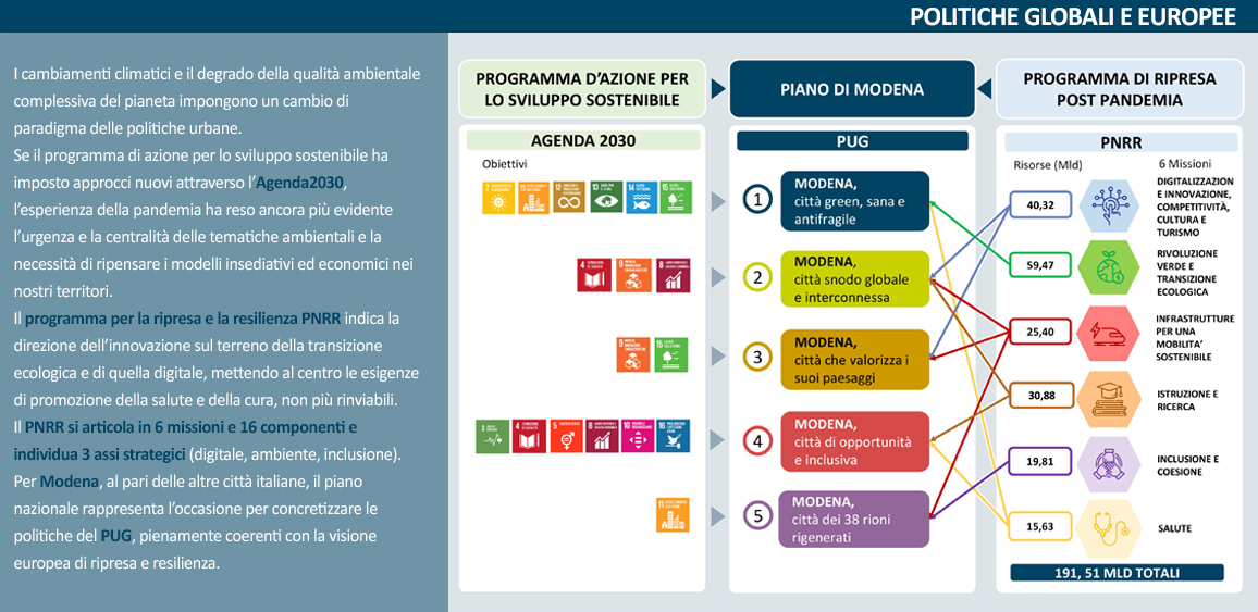 In this framework, the actions that the PUG introduces to achieve the vision of the city have been the subject of discussion and revision, analysis and comparison with agencies, associations, citizens and technicians, towards a final version that is as shared as possible, giving great importance to the possibility of intercepting the resources of the PNRR. For Modena, as for other Italian cities, the national plan represents the opportunity to materialize the policies of the PUG, fully consistent with the European vision of recovery and resilience, in which the project of the public city and of the endowments plays a central and qualifying role in response to the emergencies and fragilities of the territory.