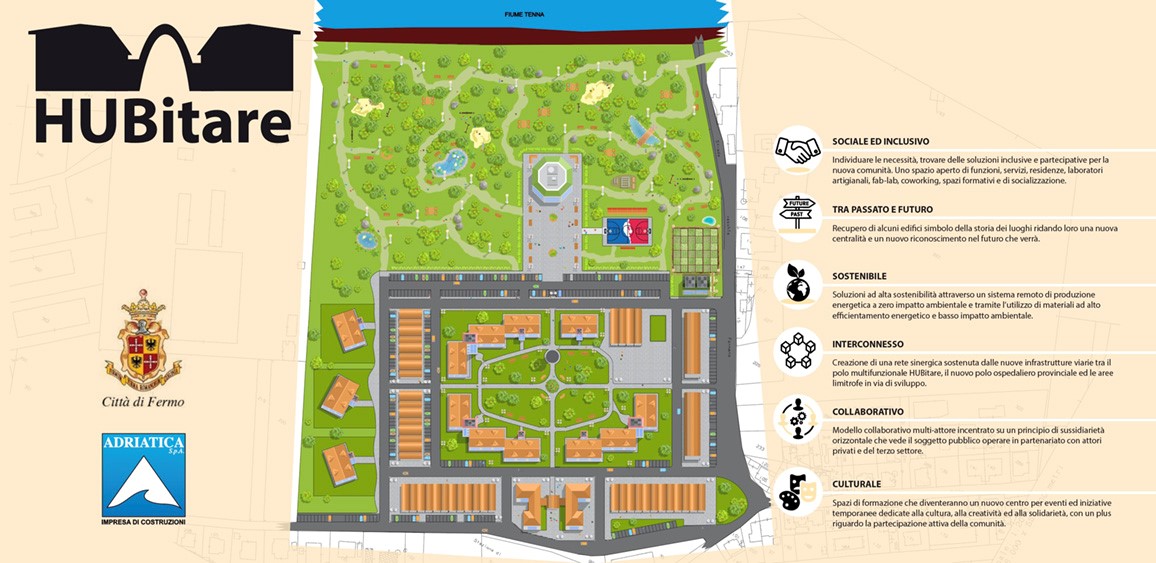 Hubitare prevede la costruzione di un nuovo insediamento abitativo di housing sociale cui si affiancheranno interventi rivolti a dotare l’area di servizi di prossimità, di assistenza e cura della persona, di spazi comuni inclusivi, sistemi per la produzione di energia a basso impatto, aree verdi attrezzate e luoghi della collettività per la partecipazione culturale della comunità con cui garantire elevati standard di qualità dell’abitare. La riqualificazione e, in alcuni casi, il recupero di alcuni manufatti presenti nel sito, ha lo scopo non solo di valorizzarne l’importante memoria storica ma anche di ridisegnarne una nuova identità che generi nuova appartenenza ed energie nella comunità locale in grado di contribuire attivamente al processo di rigenerazione stesso.
