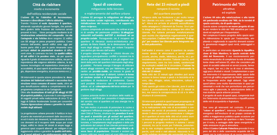 L’esperienza di Treviso riguarda un’importante traguardo amministrativo derivante dalla partecipazione al bando ministeriale sulla “Qualità dell’abitare” che consentirà la riqualificazione di taluni ambiti non coesi con l’odierno sviluppo urbano. Esigenza addivenuta ancora più urgente dopo il periodo pandemico che abbiamo vissuto e che stiamo ancora affrontando.