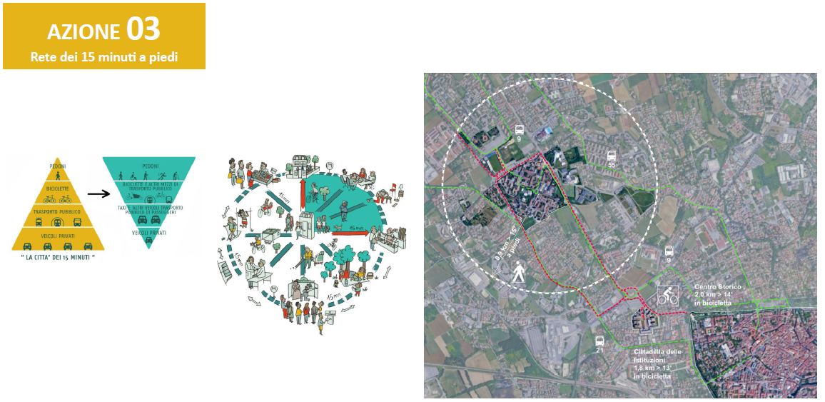 Altro importante traguardo sarà quello della valorizzazione dello spazio identitario centrale del quartiere, a mezzo dell’inserimento di servizi che fungeranno da catalizzatori sociali sia per i cittadini che per i principali stakeholders, unitamente all’innesto di nuove connessioni aventi il fine di creare una rete di prossimità (rete dei 15 minuti) collegata con una matrice di mobilità lenta parallela, finalizzata ad unire le progettualità con le realtà territoriali presenti nel tessuto urbano ed il centro storico, avvalendosi, di rinnovati percorsi protetti e sostenibili.