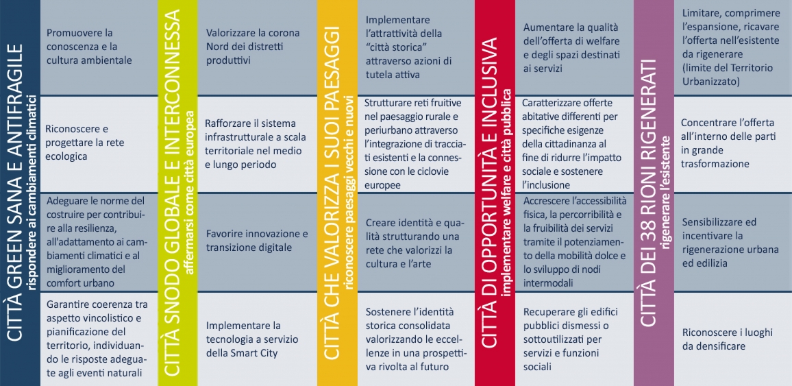 Strategia, Disciplina, Quadro Conoscitivo, ValSAT e Vincoli e tutele, affrontano, ordinano e traducono le scelte di piano e orientano le trasformazioni.