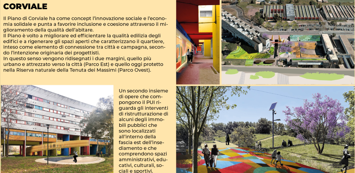 Corviale: Il Piano di Corviale ha come concept l’innovazione sociale e l’economia solidale e punta a favorire inclusione e coesione attraverso il miglioramento della qualità dell’abitare.