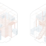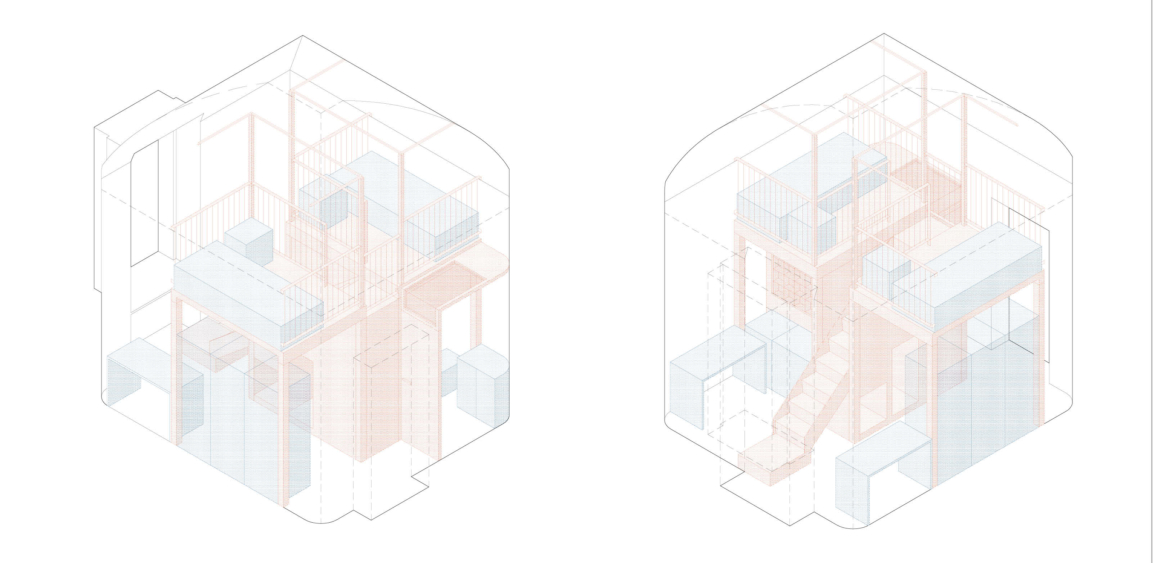 The two extremes accommodate common spaces while the original linear development inpatient rooms are converted into rooms for students: The proposal identifies a two-level accommodation model that allows for the housing of 34 accommodation spaces while preserving the original architectural conformation thanks to the inclusion of an autonomous structure capable of housing study space and sanitation in the lower part and sleeping space in the upper part. A solution that guarantees a private dimension suitable for the well-being of students and that respects the history of the pavilion.