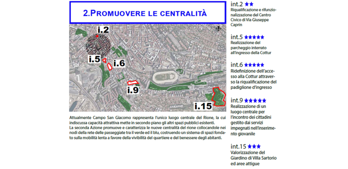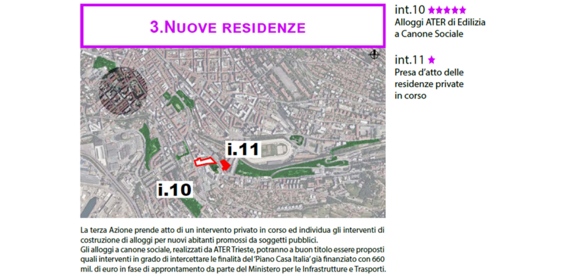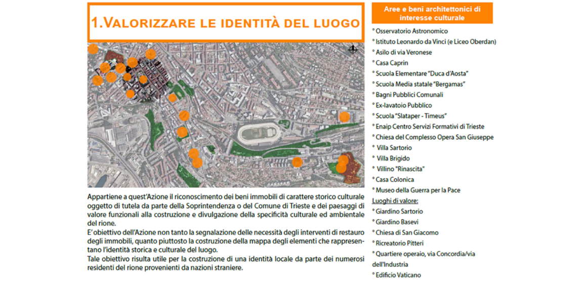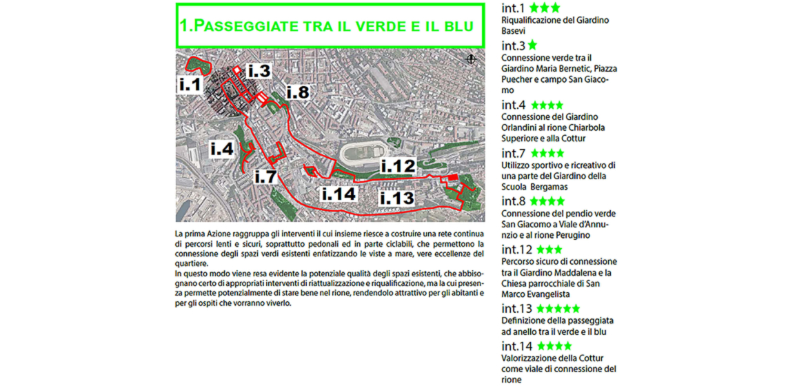 Sono state quindi individuate azioni materiali e immateriali da porre in essere per raggiungere l’obiettivo della rigenerazione. Tra queste la creazione di una nuova centralità con la costruzione di un progetto integrato tra nuove residente di edilizia pubblica realizzati da ATER Trieste, spazi pubblici aperti e nuovi volumi da mettere in gioco assieme alle realtà di formazione professionale. Un altro elemento di progetto è la realizzazione di una “passeggiata tra il verde ed il blu” che metta in relazione le numerose aree verdi pubbliche con gli scorci panoramici e la rete ciclopedonale così da creare un itinerario che sia un riferimento per il quartiere e valorizzi la sua identità.